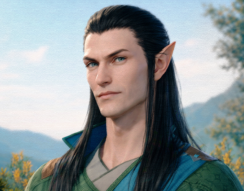ЗОВНІШНІСТЬ Невисокий і худорлявий. Має характерну для місячних ельфів зовнішність: дуже бліда шкіра, чорне волосся, яскраво лазурний, з золотавими спалахами, колір очей. високі скули, тонке підборіддя й прямий ніс. Різкі риси обличчя та опущені кутики тонких губ надають ельфу постійно невдоволеного вигляду. Голос багатий на інтонації, але – об’єктивно – не_мелодійний. Вдягається ельф охайно, хоча видно, що гардероб в нього небагатий. В місті носить мантію, щоб підкреслити свій статус чарівника і вченого; для подорожі обере щось більш практичне.